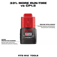 Each battery pack is durably built for heavy-duty use, runs cooler, and performs in climates below 0°F/-18°C. Its compact, lightweight design allows you to work in tight work spaces and reduces fatigue. Built-in REDLINK™ Intelligence protects the battery from overloads, preventing you from damaging your cordless power tools in heavy-duty situations, while the discharge protection prevents cell damage. An integrated temperature management system and individual cell monitoring help to maximize your battery's life. Switch to our REDLITHIUM™ CP2.0 Compact Battery Pack to instantly upgrade the runtime and durability of your Milwaukee M12™ cordless tools.
